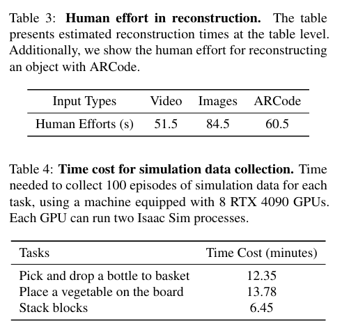 Table 3에서는 입력 데이터 유형에 따른 처리 속도를 비교했고, 비디오를 입력으로 사용할 경우 모션 블러로 인해 품질이 약간 저하될 수 있지만 처리 시간이 단축되는 반면, 이미지를 활용하면 품질이 향상되지만 처리 시간이 조금 더 소요됐다고 합니다. 또한, ARCode를 활용하여 단일 객체를 재구성하는 데 걸리는 시간을 측정하고, 이를 바탕으로 장면 전체를 재구성하는 데 소요되는 총 시간을 계산했습니다. 시뮬레이션 데이터 수집 속도를 평가를 위해서는 zero shot 평가를 위해 만든 작업별로 100개의 시뮬레이션 에피소드를 생성하는 데 걸리는 시간을 측정하였습니다. 실험에는 8개의 RTX 4090 GPU를 사용하여 병렬 연산을 수행하였으며, 시뮬레이션을 활용한 데이터 수집이 실제 환경에서 teleoperation 방식으로 데이터를 수집하는 것보다 훨씬 빠르고 비용 효율적인 방법임을 확인했다고 합니다. 100개의 에피소드를 위해 10분 남짓의 시간이 필요한 것을 보면 굉장히 빠른 것 같습니다.