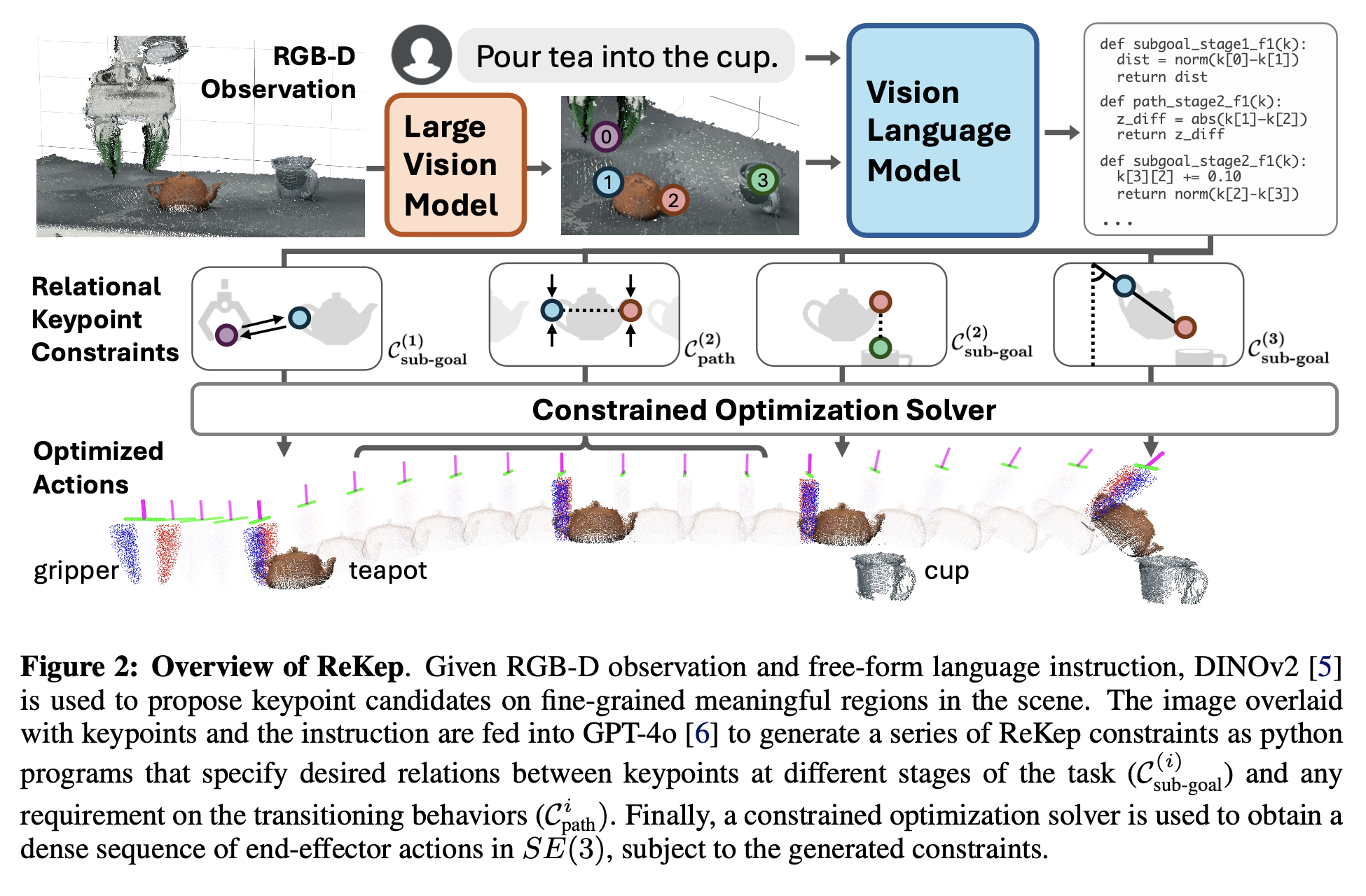 즉, “어떤 시점에 주전자를 잡고, 어떤 시점에 컵 위로 가져가고, 어떤 시점에 기울여 붓는지”를 결정하는 동시에, 매 시점에서 keypoint들이 주어진 ReKep 제약을 만족하도록 해야 합니다.