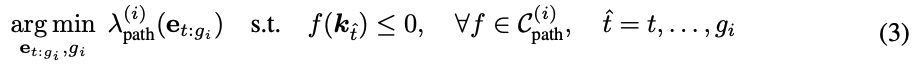 \sum_{i=1}^{N} \Bigl[ \lambda_{\text{sub-goal}}^{(i)}\bigl(e_{g_i}\bigr) + \sum_{t=g_{i-1}}^{g_i} \lambda_{\text{path}}^{(i)}\bigl(e_{t}\bigr) \Bigr]왼쪽의 목적함수에선 단계마다 람다로 표현되는 서브-골 비용과 경로 비용을 합산합니다. 예를 들면, 충돌 회피, 에너지 사용 최소화, 경로의 부드러움, 그리핑(grasping) 품질 향상 등이 있겠습니다. 그런 다음 s.t. 옆의 맨 윗줄이 초기조건이 되겠고, 2번째줄은 sub-goal constraints, 3번째줄은 path constraints, 4번째줄은 keypoint forward model이 되겠습니다. 해당 수식의 모든 제약 조건을 동시에 만족하는 목적함수를 최적화시키는 해를 찾아내는 것이죠.