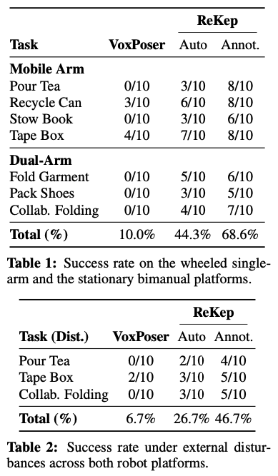 우선 저자들은 ReKep을 두 가지(모바일 싱글암, 고정형 듀얼암) 실제 로봇 플랫폼에서 실험합니다. 평가 메트릭은 작업성공률로, 작업별 총 10번의 시도를 진행합니다. Auto의 경우 이 논문에서 제안한 방식대로, VLM&LVM을 사용해 자동으로 ReKep 제약을 생성하는 방식이고, Annot의 경우 사람이 직접 ReKep 제약을 설정한 경우입니다.