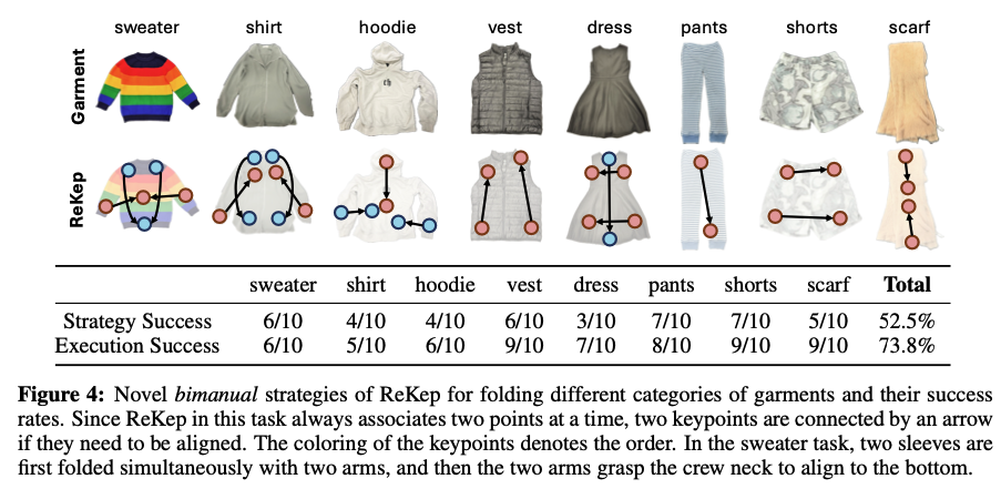 더불어 ReKep은 Fig4에 보이는 것처럼, 듀얼암을 사용한 위의 옷 개기 태스크에서도 좋은 모습을 보입니다. 구조화되지 않은 환경에서 꽤나 사람이 옷을 개는 것과 유사하게 올바르게 제약을 수립하고 이를 실행하기 위한 keypoint 역시 보이는데, 하나 의문인 점은 DINOv2와 SAM을 이용해 Keypoint 후보를 뽑아낼 때, 마스크를 k=5개 만큼 클러스터링하고 그것의 중심점으로 keypoint를 삼았는데, 해당 방식으로 어떻게 위와 같은 옷을 접을 때 필요한 핵심 부위들을 저렇게 잘 집어낼 수 있는가는,, 이건 진짜 코드를 보지 않으면 모를 것 같습니다. voxposer 논문도 약간 논문과 demo상으로는 되게 거창하게 표현했는데, 사실 알고 보니 simulator 코드의 구조만 좀 복잡하고 실제 voxposer의 개념에 해당하는 voxel map과 규제 맵 등은 꽤나 심플하게 코드가 이루어져있었습니다. 그런 것처럼 해당 ReKep 논문도 리뷰가 끝나고 코드를 좀 뜯어봐야할 것 같습니다.
