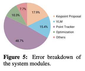 Fig 5는 시스템의 실패 사례 중에서 error가 일어난 모듈에 대한 비율을 다룬 분석입니다. 다르게 말하면 시스템이 각각 모듈화되어 있어 error를 추적하기 용이하다는 장점이 있습니다. 위 그림에서는 Point Tracker가 가장 많은 오류를 유발하는 것으로 나타났는데, 이는 관찰 도중 간헐적인 occlusion이 keypoint 추적을 어렵게 만들기 때문이라고 합니다. 반대로 Optimization의 경우에는 error 비율이 상당히 낮은 것을 볼 수 있는데, 이는 대부분의 작업에 대해 수학적으로 계산 가능한, 유효한 해가 대체로 다양하게 존재할 수 있기 때문이라고 합니다. 결론으로는 Occlusion 문제를 해결하는 것이 해당 태스크의 가장 큰 병목이 아닐까 생각합니다.