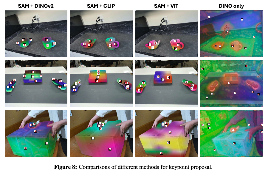 위 Fig 8은 키포인트 제안을 위해 사용되는 여러 visual feature extractor로써 LVM을 어떤 것을 사용하냐에 따른 정성적 결과물인데, 일단 marking prompting 방식이 눈에 확 들어오구요.(이 쯤 되면 마킹 visual prompting은 이제 GPT4o 에게 grounding을 맡기기 위한 일반화된 과정이 된 게 아닌가 싶습니다.) 위 그림은 3가지 장면 각각에 대해 각 모델에서 추출된 feature map을 RGB 공간으로 투영한 결과와 이 특징들을 클러스터링하여 얻은 키포인트 후보들을 시각화해놓은 것입니다. 눈여겨볼 점은, SAM이 없이 진행될 경우엔 객체가 아닌 부분에도 클러스터 포인트가 생기거나 객체 경계가 불분명해지는 모습을 보이는 것으로 보아, SAM이 내뱉는 어떤 객체성을 지닌 마스크는 특징 맵에서 노이즈를 줄이는 데 매우 중요하다는 것을 보입니다. 그리고 CLIP과 ViT와 비교해봤을 땐 DINOv2가 역시 세밀한 객체 정보를 잘 이해하고 있음을 보입니다. 개인적으로는 객체의 affordance에 조금 더 초점을 맞추어 point proposal을 뱉을 수 있는 방식이 절충되어 개선될 수 있다면 좋을 것 같다는 생각도 듭니다!