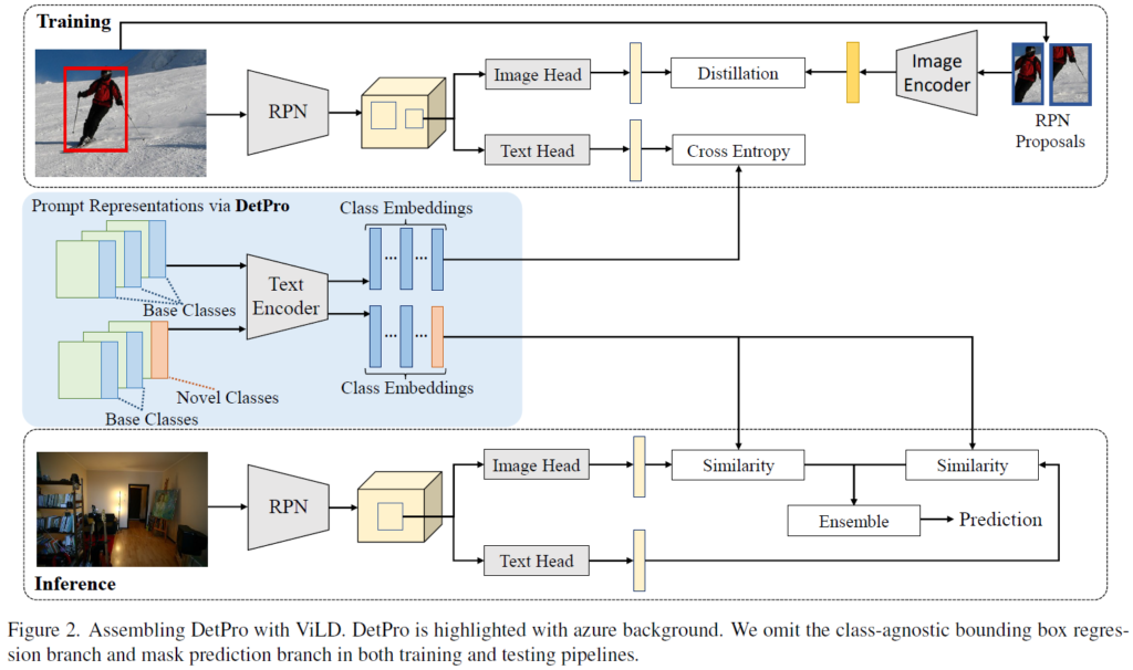 ViLD는 당시 OVOD의 최신 프레임워크였습니다. CLIP의 knowledge를 2-stage detector(Faster RCNN)에 distillation을 진행하여 구성된 프레임워크입니다. 저자들은 Figure 2와 같이 DetPro를 ViLD와 결합하였습니다.
