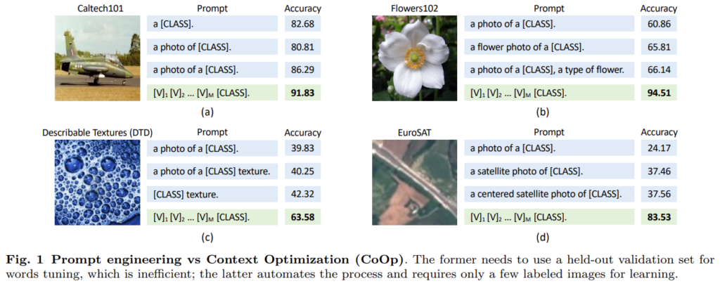 VLM의 동작에서는 language 입력에 사용되는 사용되는 프롬프트의 설계가 매우 중요합니다(보통 우리가 prompt engineering이라고 하죠).위의 Fig.1은 2022년 IJCV에 게재된 논문 Learning to Prompt for Vision-Language Models의 figure인데, 프롬프트의 작은 차이로도 그 성능 결과가 크게 달라질 수 있음을 보여줍니다. 마찬가지로 OVOD를 수행하기 위한 프롬프트를 설계할 때에도 최적의 프롬프트를 찾아내는것이 중요하지만, 적절한 프롬프트를 설계하는 과정에서 도메인에 대한 지식을 가지고 있는 사람이 시행착오를 겪으며 심혈을 기울여 작업해야 하기에 상당히 비효율적입니다. 이런 한계를 완화하기 위해 자동적으로 prompt의 context를 학습하고자 하는 시도가 있어왔고, 본 논문의 연구에서 OVOD에 prompt representation learning을 최초로 적용하였습니다. (위의 IJCV 논문에서 제안한 CoOp은 classification에 대한 프롬프트를 학습한 방법론이었습니다)