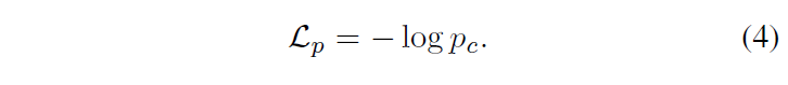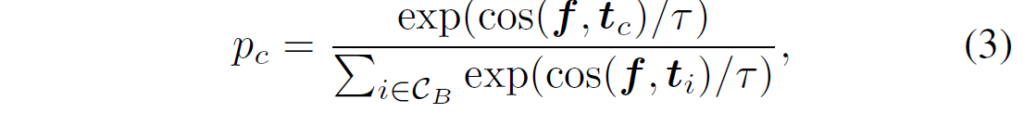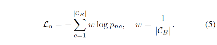 background가 약간의 object class를 포함하고 있을 가능성이 있긴 하지만 일번적으로 너무 작거나 모호한 맥락을 갖게 될 것입니다. 이를 다르게 해석하면 nagative proposal n에 대한 이미지 인코더 출력값인 이미지 임베딩 {f}_{n}은 어떠한 class embedding {t}_{n}와도 유사성을 찾기 어려울 것입니다. {f}_{n}에 대한 클래스 확률 {p}_{nc}는 위의 수식 3(cos 유사도에 대한 softmax)로 계산되는데, 저자들은 이 {p}_{nc}가 항상 작아지도록 학습시키고자 했습니다. 이 때 base class의 크기가 충분히 크니, {p}_{nc}를 단순히 1/(base class의 크기)에 가까워지도록 학습을 진행했습니다. 만약 base class의 수가 1000개라면 모든 {p}_{nc}가 1/1000에 가까워지도록 최적화를 진행한 것이죠. 이 학습은 다음과 같은 loss 로 진행되었ㅅ브니다.