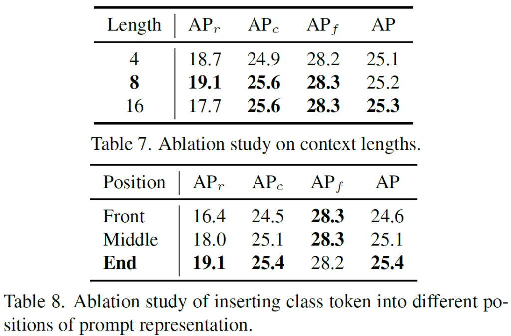 Table 7에서는 context 길이 L에 대한 ablation study결과를 나타내었습니다. CoOp에서는 긴 prompt를 사용하는 것이 close-vocabulary image classification에서 좋은 결과를 낼 수 있음을 보였는데, 저자들은 base class에서도 동일한 결과를 얻을 수 있었습니다. 하지만 novel class에서는 그렇지 못하고 prompt가 길어지면 base category들에 overfitting 될 수 있다고 합니다. 저자들은 context length L의 기본값을 8로 설정하였습니다.