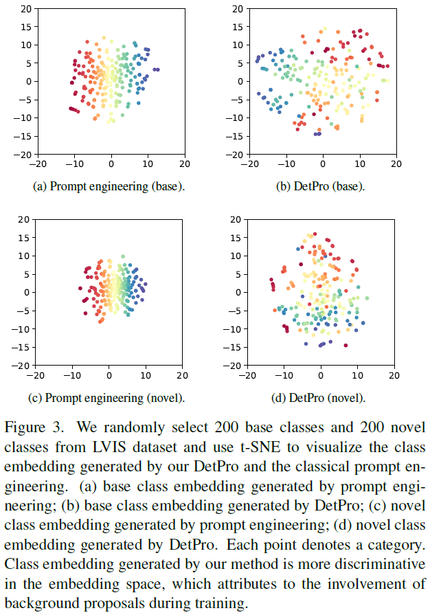 마지막으로, 저자들은 DetPro와 기존의 prompt engineering으로 생성된 class embedding을 t-SNE로 시각화 한 결과를 Figure 3에 나타내었습니다. 이 때, LVIS에서 200개의 base class와 200개의 novel class를 무작위로 뽑아서 사용했습니다. 시각화 결과, DetPro로 생성된 class embedding이 임베딩 공간에서 더욱 구별됨(discriminative)을 확인하였습니다. 이는 open-vocabulary object detector의 region classifier로써 더욱 좋은 능력을 갖춤을 의미한다고 주장하고 있습니다.