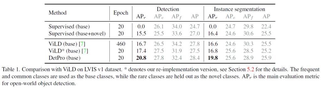 Table 1은 LVIS v1에서 ViLD의 결과를 보여주는 메인 실험 결과입니다. 이 때 ViLD*는 저자들이 재구현한 보전입니다. 이 때 SoCo 사전학습법을 사용한 ViLD는 사전학습 epoch를 460->20으로 줄이면서 기존의 ViLD에 견주는 성능을 보인다고 어필합니다. 저자들이 제안한 DetPro를 적용하였을 대, ViLD* baseline보다 object detection에서 +3.4 APr을, instance segmentation에서 +3.0 APr 결과를 보였습니다.