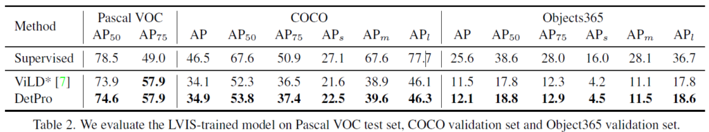 ViLD와 마찬가지고, 저자들은 LVIS에서 사전학습한 DetPro를 다른 데이터셋에 transfer한 실험을 수행하였습니다. Pascal VOC 2007, COCO, Object365에서 class token을 교체하여 평가를 진행했습니다. Table 2에 결과가 나타나있는데, DetPro를 적용했을 때 좋은 일반화 성능을 보이며 적용에 효과적임을 확인할 수 있었습니다.