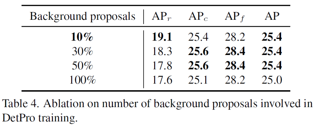 negative proposal을 활용하는것이 중요함은 알았지만, 이를 얼마나 사용해야 하는지에 대한 결정이 필요해 이에 대해 실험 또한 수행되었습니다. 결과적으로 negative sample이 늘어날수록 좋지 않은 결과를 보였습니다. negative를 줄이는것이 학습의 속도를 높일 수 있을 뿐만 아니라, background에 편향되는 것을 완화할 수 있다고 합니다. 저자들은 기본 값으로 10%를 사용하였습니다.