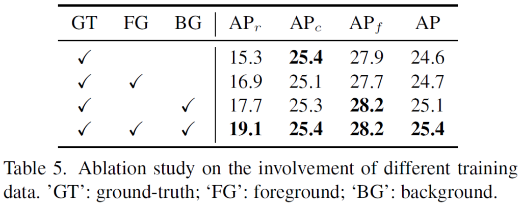 학습에 GT, Foreground, Background를 어떻게 조합하는것이 좋은지에 대한 실험도 수행되었습니다. 결과적으로는 foreground나 background를 제외하면 성능이 저하되었으며, GT, Foreground, Background를 모두 조합하여 활용하는것이 효과적임을 확인할 수 있었습니다.