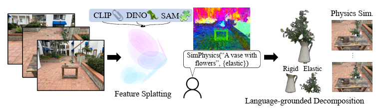 먼저 input 이미지들을 사용하여 3d gaussian으로 reconstruction 해줍니다.( 위 figure에 나온 꽃병 그림을 예시로 들겠습니다.) 그 다음 Feature Splatting을 통해 CLIP, DINOv2, SAM과 같은 모델에서 얻은 semantic feature 들을 추가하고 최적화 해줍니다. 이렇게 만들어진 3D Gaussian들은 객체의 기하학적, 의미적 정보를 모두 포함하고 있게 됩니다. 이후 사용자가 자연어 query(꽃이 담긴 꽃병)를 던지면, CLIP정보를 바탕으로 해당 객체를 장면에서 찾아내게 됩니다. 이 과정에서 꽃병꽈 꽃을 더욱 세부적으로 객체를 물리적 특성으로 구분하게 됩니다. 즉, query 안에서도 꽃병과 같은 단단한 부분과, 꽃과 같은 유연한 부분을 별도로 인식하여 나누어주비낟. 이 과정을 자동으로 진행하고, 이후 MPM인 Taichi를 활용해 추가적인 augmentation을 진행할 수 있다고 합니다. 저절로 알고있는 물리적 특성을 등록해주지만, 원한다면 사용자의 추가적인 query를 통해 다른 특성을 부여할 수도 있습니;다.