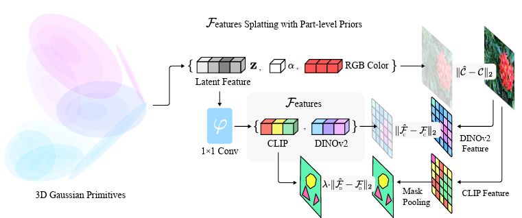 저자는 기존 Gaussian Splatting 방법의 각 가우시안에 feature vector를 추가 해줍니다. 이 feature는 view-invariant하고, 색상과는 별개로 존재하게 됩니다. 렌더링 과정에서 각 픽셀의 최종 특징 맵은 여러 가우시안에서 투영된 특징 벡터들이 투명도(alpha compositing)를 기반으로 혼합된 형태로 만들어지는데, 이 과정 전체가 미분 가능하기 때문에, 실제 이미지로부터 얻은 feature map과 비교해 각 가우시안을 최적화할 수 있다고 합니다. (사실 미분가능한게 무슨 의미인지 잘 모르겠습니다..)