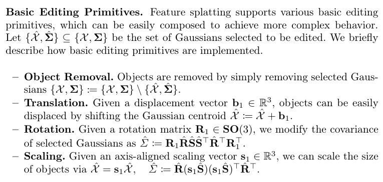 객체를 삭제할때는 그저 해당 객체로 분류된 가우시안들을 전체 가우시안 집합에서 제거하는 방식으로 진행됩니다. 가우시안의 표현 방법에 따른 이점? 인 것 같습니다. 이동할 떄는 displacement vector b1을 사용하여 중심점을 이동시킵니다. 가우시안은 mean으로 위치를 표현하기 때문인 것 같습니다. displacement vecotr를 더해주면 됩니다. 객체를 회전시킬 때는 공분산 행렬을 변환시켜야 합니다. 가우시안은 공분산 행렬이 회전 R과 크기를 나타내는 S로 이루어져 있는데, 회전을 할 때는 위 설명의 Rotation에 적힌 수식을 통해 가능합니다. 마지막으로 크기 조정인데요, 객체의 크기를 바꾸려면 축이 정렬된 크기 벡터 S1을 통해 진행해야 하고, 중심점의 좌표를 우선 스케일링해서 위치를 바꾼 다음 공분산행렬도 크기 조정 벡터를 통해 변경합니다. 식은 위 설명의 scaling에 적힌 것 과같ㅅ브니다. 정리하자면 가우시안으로 표현된 feature이기 때문에 이렇게 벡터 연산만으로 물체를 다양하게 editing 할 수 있고, 그대로 scene에 반영할 수 있는 것 같습니다. 아래와 같이 scene을 편집할 수 있습니다