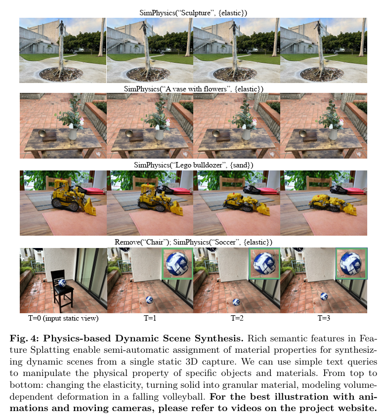 Feature splatting을 통해 합성된 장면들의 정성적인 결과들입니다. 탄성이 있게 변형하거나 모래같은 입자, 부피 보존이 중요한 공같은 다양한 물리적 특성을 잘 반영하고 있고, 이러한 특성은 사용자가 제공한 text queyr를 기반으로 미리 정의된 재질 중에서 자동으로 선택된 물리적 특성이라고 합니다.