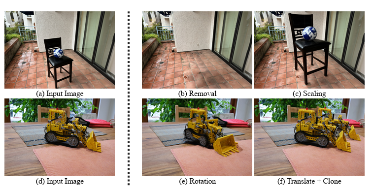 저자들은 객체 제거나 이동 후에 배경에 대한 인페인팅 처리가 이루어지지 않아서, 이러한 작업 후 배경에 이상한 모습이 발생할 수 있다고 합니다. 이는 기존 연구에서 상대적으로 단순하게 확장이 가능한 문제이나, 현재 구현에서는 인페인팅 기능이 포함되어 있지 않아 특정 상황에서 자연스럽지 못한 결과를 초래할 수 있다고 하는데, 생성형 모델을 사용해서 메꾸는건가? 싶습니다,,