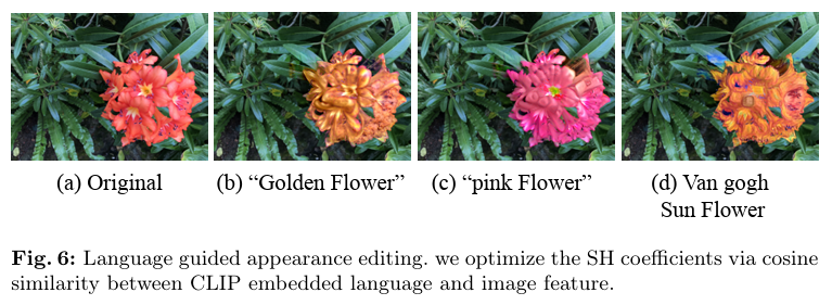 앞서 scene augmentation의 예시로 들었던 object removal, scaling, rotation, translation이 잘 진행된것과 더불어 객체의 외형적인 편집도 간단하게 가능했닫고 합니다. 먼저 특징 스플래팅 기법을 이용하여 장면을 학습한 뒤, 선택된 가우시안 중심점의 SH (Spherical Harmonics, 구형 조화함수) 값만을 업데이트하여 객체의 외형을 바꿀 수 있다고 합니다. 이를 위해 렌더링된 이미지와 CLIP 텍스트 프롬프트로 얻은 feature 와 cosine loss를 사용했습니다. 예를 들어 “A photo of an <Adj> . flower” (Adj에는 형용사를 넣을 수 있습니다)와 같은 자연어 입력을 주면, 장면 내 꽃의 색상이나 스타일이 자연스럽게 수정되는 것을 아래 figure처럼 확인할 수 있습니다. 이렇게 외형을 편집할 때도 배경 부분은 그대로 유지되며, 2,500번 정도의 iteration만으로도 결과를 얻을 수 있다고 합니다.