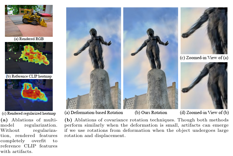 여러 모델을 동시에 사용하기 떄문에 정규화(multimodel regularization)의 효과를 검증했다고 합니다. 그림 (a)의 위쪽 이미지는 원본으로 렌더링된 RGB 이미지를 나타내며, 아래쪽 두 이미지는 feature map을 시각화한 것입니다. 단순히 CLIP 특징만 사용하면, 렌더링된 특징에 노이즈가 많습니다.