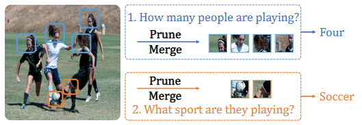 이전의 Vision-only 또는 Text-only 연구에서 Image/Text token을 줄이며 모델의 연산량을 줄이고자 pruning으로 태스크에 대한 non-salient token을 제거하는 방식을 학습하거나, 또는 merging으로 유사한 의미의 token을 묶습니다. 저자는 이들의 방식을 따로 활용함은 VL 문제에서 두 문제가 존재합니다: 1. salient image token은 텍스트 입력에 따라 다릅니다. 즉, 위 Fig. 1에서 1번째 질문에서는 사람이, 2번째 질문에서는 축구공이 salient image token에 해당합니다. 2. 모달리티 (이미지, 텍스트)에 관계없이 token을 merging하면 VLM에 혼동을 주는데, 이는 텍스트와 이미지 token의 representation이 동일한 semantic space에서 완벽히 align되지 않기 때문입니다.