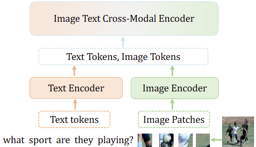 위의 Fig. 2는 Text Encoder와 Image Encoder, 그리고 이들에 대한 Cross-Modal Encoder로 구성된 일반적인 VLM 구성을 보여줍니다. Text Encoder와 Image Encoder는 각각의 Backbone도 있고, FPN과 같은 Feature Representation을 높이기 위한 모듈들도 있겠죠. 이들은 입력에 대해 텍스트는 Text tokens로, 이미지는 Image Patches로 토크나이징합니다 (이 토크나이징에서 얼만큼 좋은 품질의 token으로 만드는지는 이번 논문에서는 중요하지 않습니다). 이후 Cross-Modal Encoder에 이들의 토큰이 쉽게 생각하면 막 섞이게 됩니다. 이 섞이는 과정은 텍스트와 이미지라는 각기 다른 모달리티의 입력에 대해 정보를 교류하며 서로에 대해 이해하는 과정이라 생각하면 쉽습니다. 이렇게 정보를 교류하는데에는 Transformer 방식 (Cross-attention)만한게 없습니다. 일반적으로 VLM에서 텍스트 입력에 대한 token은 기껏해야 몇 개에서 몇 십개이지만 (위 Fig. 1의 예시에서는 4개의 단어로 구성되어 있습니다), 이미지의 경우 입력 해상도를 384×384에 patch의 크기를 16으로 둔다면, 토큰의 수는 (384/16)^2 = 576으로 몇 백개, 해상도에 따라 몇 천개의 patch (token)를 가질 수도 있습니다.