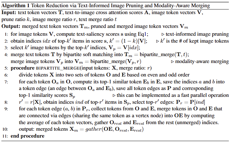 방식은 비교적 간단합니다. cross-modal encoder내 n개의 layer에 대해, 첫 번 째 f번째 레이어 이후, 특정 layer에서 k%의 토큰을 지웁니다 (pruning). 단순히 지우지는 않고, 텍스트 정보에 가이드 받아 지우며 이 토큰들은 이후의 layer에서 사용되지 않습니다. 그 이후 token reducer는 r%의 이미지 token과 t%의 텍스트 token을 합칩니다 (merging). 위 방식의 token reducer는 f와 n 사이의 레이어 몇몇에 걸쳐 사용됩니다. 직관적으로 지워진 토큰들이 이후의 layer에서 사용되지 않는다는 점에서, 앞 쪽의 layer에서 token을 줄인다면 더 높은 연산 효율성을 보일테지만, 반대로 그만큼 해당 token이 충분히 필요한지/하지 않은지에 대해 명확하지 않는 지점일 수 있기에 성능 저하가 심해질 수도 있습니다. 이후의 과정을 포함하여 저자는 다음의 알고리즘에서 전체 과정을 요약하나, 의사 코드는 아니기에 다소 복잡해보입니다. 고로, 계속 문장으로 설명하도록 하겠습니다.