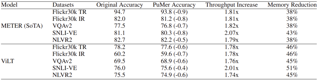저자는 당시의 SotA VLM인 ViLT와 METER를 기반으로 실험합니다. ViLT는 110 million parameter를, METER는 330 million parameter를 가지는 모델로, 각각 PuMer-ViLT와 PuMer-METER로 명명됩니다. 두 VLM 모두 12개의 Transformer Encoder (위에서 설명한 Cross-modal Encoder)를 가지는데, 저자는 Image-Text Retrieval, VQA, Visual Entailment, Visual Reasoning의 4가지 태스크에서 이들의 성능과 효율성을 비교합니다.