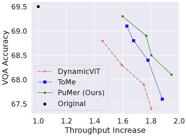 반면 동일한 하나의 모델에서 위에서 언급한 이전 연구인 DynamicViT, ToMe, PuMer 방법과의 비교에서 Throughput Increase 1.8x에서 비교하면 PuMer는 가장 높은 성능을 보입니다 (논문에선 이렇게만 표현하지만, 1.6x 이상의 모든 지점에서 PuMer 방식이 높은 성능을 보입니다. 반면 Accuracy가 1% 정도 하락한 시점에서, PuMer는 가장 높은 Throughput Increase를 보입니다.