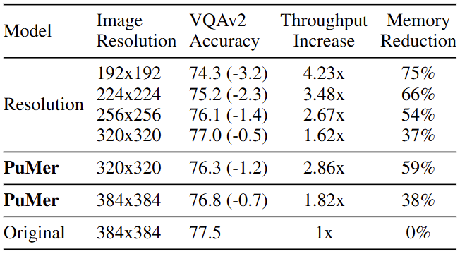Tab. 2에서는 Resolution에 따른 성능 및 효율성 비교를 보입니다. Resolution을 줄이는 방식은 가장 직관적으로 연산 효율성을 높일 수 있으면서도, 동시에 가장 직관적으로 성능이 낮아지는 방식입니다. Original의 384×384도 사실은 일반적인 이미지를 고려할 때, 굉장히 낮은 해상도입니다. 이미지의 크기를 1/2인 192×192로 낮추면, Throughput Increase는 4.23x, Memory Reduction은 75% 향상된 모습을 보이지만, 성능이 3.2% 하락합니다. Throughput Increase만 고려하면 확실히, 이미지의 크기가 작다는 의미가 곧 Image token 자체가 작다는 의미 (384×384에서 Patch size 16일 때의 Image token 개수는 576인 반면, 192×192에서는 144입니다)이므로, 가장 효과적이기는 합니다. 유사한 비교를 위해 PuMer를 320×320, Resolution을 320×320으로 줄였을 때, PuMer는 단순히 Resolution을 줄이는 것에 비해 약 1.5배 정도의 연산 효율성을 보입니다 (신기하게도 성능은 더 하락하기는 합니다).