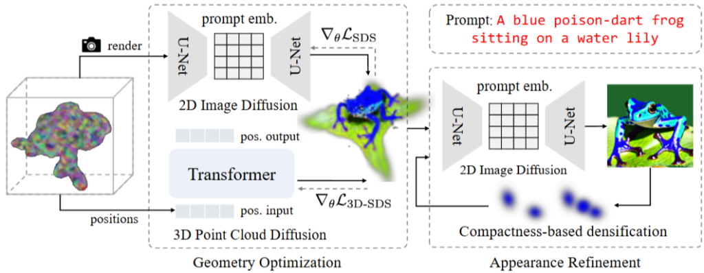 앞서 언급했던것 처럼 3D 모델을 최대한 현실적이고 정교하게 구성하는 것이 GSGEN의 목표이고, 이를 기하학적인 prior를 통합할 수 있고 유연하게 사용할 수 있는 3D Gaussian을 통해서 달성하려고 했습니다. GSGEN은 크게 두 단계로 이루어져 있습니다. Geometry Optimization과 Appearance Refinement 단계로 이루어져 있고, Geometry Optimization 단계에서는 3D pointcloud Diffusion인 Point-E의 prior를 사용해 가우시안의 위치와 크기를 조정해 예시의 개구리의 기하학적인 베이스를 만들어 줍니다. 이때 2D Image Diffuion의 prior와 함께 SDS를 사용해 일관성을 확보합니다. 위치 정보는 트랜스포머를 활용해 처리한다고 합니다. 이어서 Appearance Refinement 단계를 거칩니다. 이 때는 diffusion을 통한 2D 이미지 prior만을 활용해 가우시안을 계속 업데이트 하고, Compactness-based densification을 통해 풍부한 디테일을 완성한다고 합니다. 각 단계별로 좀 더 자세히 알아보도록 하겠습니다.