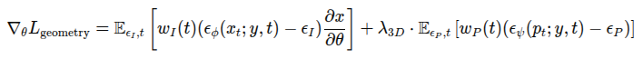 두 번째 항은 3D pointcloud 들의 위치 정보를 포함한 노이즈가 추가된 Gaussian의 3D 좌표 p_t 기반의 loss입니다. Point-E에서 생성되는 diffusion의 노이즈는 Gaussian의 현재 3D 상에서 제거해야 할 노이즈의 방향의 기준을 잡아준다고 합니다. 이 노이즈 예측값과 실제 노이즈의 차이를 계산해 3D Gaussian들이 Point-E가 생성하는 포인트 클라우드의 자연스러운 형상과 일치하도록 위치를 수정하는 방향으로 최적화합니다.