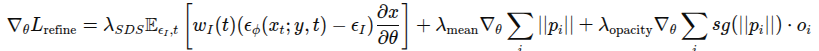 기존 text-to-3D 기법에서 자주 발생하던 문제인 Janus Problem은 여러 시점에 오버피팅 돼서 3D 모델이 구겨지거나 비현실적인 구조를 갖는 현상이라고 합니다. 모델이 앞에서 본 것과 뒤에서 본 것이 다르다면, 각 view에 맞게 오버피팅 됐을때는 앞뒤로 구겨진 모델이 나오거나 얼굴 뒤에 다른 얼굴이 붙어있는 등 기하구조가 붕괴됩니다. 2D diffusion만을 사용해서는 이 문제를 해결하기 힘듭니다. 하지만 NeRF와 달리 3D Gaussian은 3D pointcloud를 직접 활용할 수 있기 때문에 가우시안들의 위치를 직접 조정하는 방식으로 3D 구조를 보정한다고 합니다. 3D point들을 직접 조정할 수 있기 때문에, 2D에서 사용했던 SDS 기법의 개념을 그대로 3D에 적용시키는 방법이라고 하네요. Point-E라는 사전 학습된 text-to-pointcloud diffusion 모델을 기반으로 구조를 보정하되, 이를 그대로 적용시키면 마찬가지로 왜곡이 발생할 수 있기 때문에 아래 수식을 Loss로 하는 SDS를 적용해 pointcloud를 참조하면서 올바른, 현실적인 기하 구조를 형성합니다. Loss는 2D 이미지 기반 SDS loss와 Point-E 기반 3D SDS를 조합해서 사용합니다.