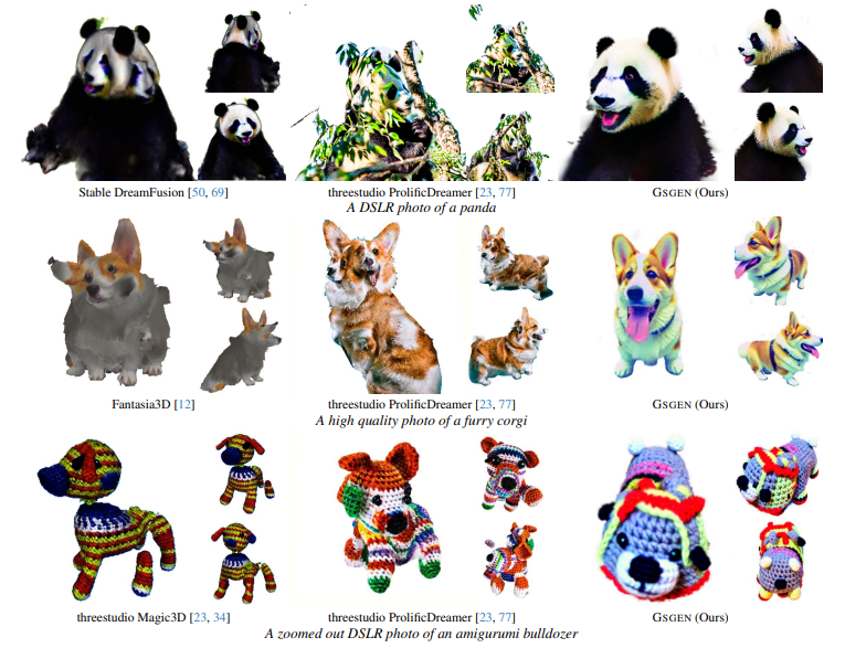 GSGEN을 stable Diffusion 기반으로 구현해 기존 SOTA 모델들과 동일하게 Guidance Scale = 100을 사용해서 실험을 진행했고, Stable Diffusion 체크포인트는 runwayml/stable-diffusion-v1-5 버전을 사용했다고 합니다. 또 기존의 DreamFusion과 동일한 focal length, 고도, 방위각을 사용했다고 합니다. 또 카메라 위치를 더 균등하게 샘플링 하기 위해 방위각에 Stratified Sampling을 적용했다고 합니다.