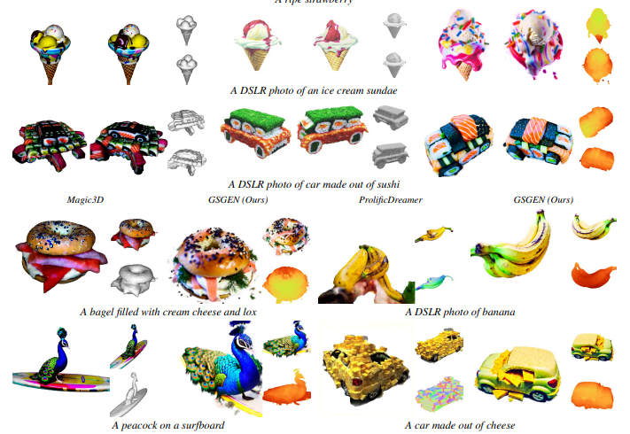 실험결과 기존 SDS 기반 방법들은 동일한 가이드 모델과 프롬프트를 사용했음에도 불구하고 3D 기하 구조가 붕괴되는 문제를 보였고, 특히 DreamFusion, Magic3D, Fantasia3D와 같은 기존 모델들은 Janus Problem 으로 인해 형상이 왜곡되는 경향이 있었다고 합니다. 반면, GSGEN은 3D Gaussian Splatting을 기반으로 안정적인 기하 구조를 유지하면서도 SDS 손실을 활용하여 디테일한 요소를 잘 표현할 수 있었습니다. 세부적인 디테일 보존 측면에서도 GSGEN은 다른 모델들 대비 뛰어난 성능을 보여주었습니다. 예를 들어 스시 위의 무늬나 공작새 깃털의 세밀한 패턴, 초가 지붕의 질감과 같은 디테일들이 다른 모델보다 더욱 선명하게 표현되었다고 합니다. Magic3D와 Fantasia3D는 메시 기반 방법의 한계로 인해 Over-smoothed한 기하 구조를 생성하는 경향이 있었으며, ProlificDreamer는 Janus 문제로 인해 비현실적인 여러개의 얼굴이 나타나는 모습을 보 ㄹ수 있습니다.