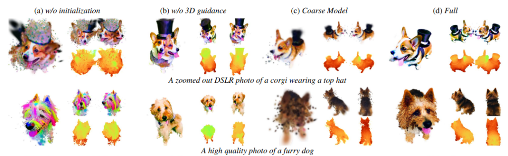 Ablation 실험 결과, Point-E 기반 initialization은 기존보다 형상 자체가 조금 더 현실적인 3D 구조를 형성하는 것을 볼 수 있고, 3D Prior를 활용하면 Janus 문제를 해결할 수 있으며, Compactness 기반 밀도 증가 방식은 Gaussian을 dense하게 만들어 세부적인 디테일을 만드는 데 효과적인 것을 볼 수 있습니다.