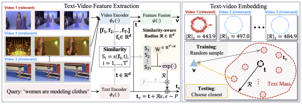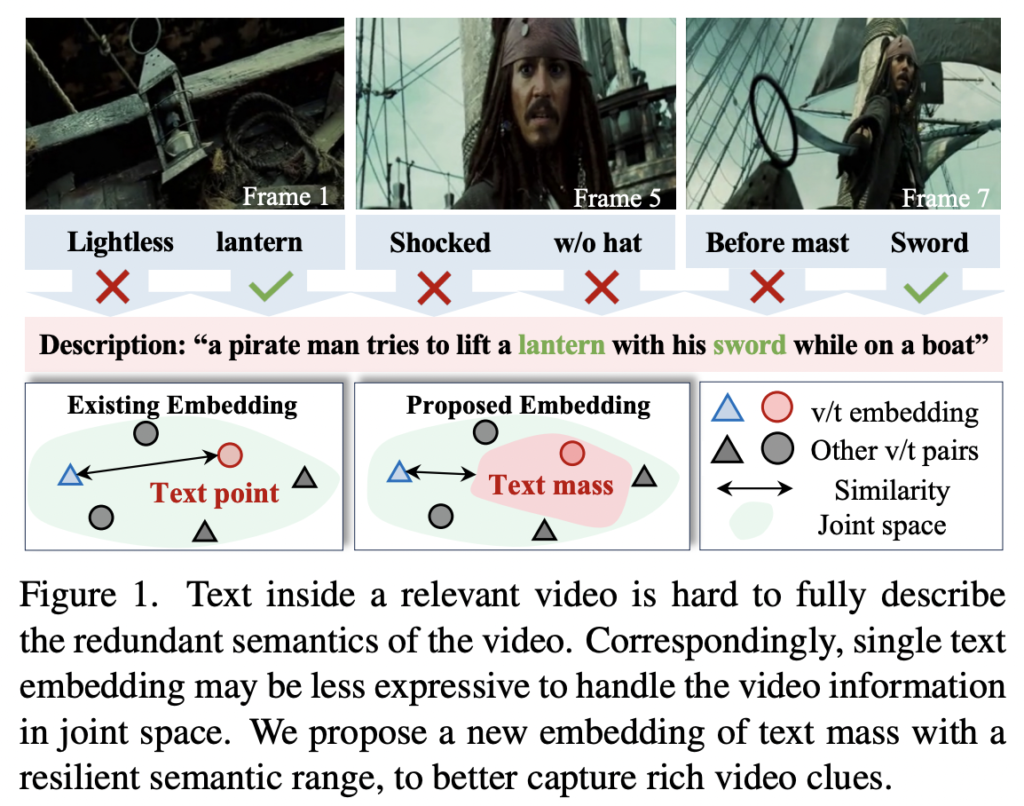 이러한 문제를 해결하기 위해 저자는 텍스트 임베딩의 표현 범위를 확장하고 유연성을 강화하고자 했습니다. 구체적으로, 단일 벡터가 아닌 특정 의미 범위(semantic range)와 연관된 ‘text mass’라는 새로운 임베딩 방식을 도입하여, 비디오 임베딩과의 유연한 대응이 가능하도록 설계했습니다.