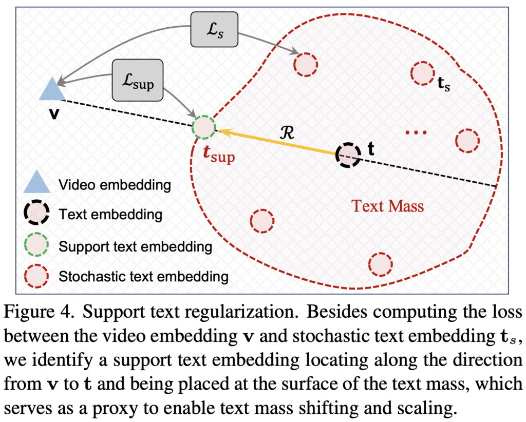 여기서, epsilon은 사전 확률 분포(P=N(0,1) )에서 샘플링된 auxiliary variable이며 R∈Rd는 text mass의 크기를 모델링하며, 기본적인 범위를 정의합니다. 기존 방식에서는 텍스트 임베딩 t와 비디오 임베딩 v 사이의 거리를 조정하는 방식을 사용했습니다. 하지만 T-MASS에서는 text mass내부에 존재하는 모든 점이 해당 텍스트의 의미를 표현하는 유효한 임베딩으로 간주될 수 있으며, 유사도 계산에도 사용할 수 있습니다. 이 방식은 기존의 텍스트 인코더를 그대로 활용할 수 있도록 하며, 최소한의 구현 변경만으로도 적용이 가능합니다.