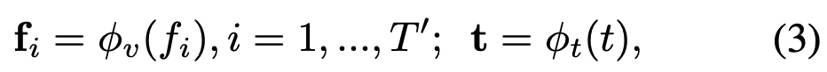 Text-Video retrieval task를 수행하기 위해서는 두 데이터를 같은 임베딩 공간에서 표현될 수 있도록 변환해야합니다. 이를 위해, 최근에는 CLIP 모델을 많이 사용하고 있습니다. 비디오는 수많은 프레임(이미지)으로 구성되어 있으므로, 모든 프레임을 분석하는 것은 비효율적이기 때문에 일부 중요한 프레임(T’개)을 샘플링하여 각 프레임을 이미지 인코더를 통해 임베딩 벡터로 변환하게 됩니다. CLIP의 이미지 및 텍스트 인코더를 각각 ϕv 및 ϕt로 나타낼때 특징 추출은 다음과 같이 정의됩니다