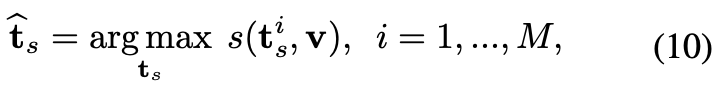 본 연구에서는 stochastic text representation을 활용하여 inference pipeline을 개선하였습니다. 우선, 주어진 텍스트-비디오 쌍 {t,v}에 대해, 텍스트 임베딩 t과 비디오 프레임 임베딩 [f1,…,fT′]을 추출합니다. 이 과정은 식 (3) 을 기반으로 수행됩니다. 이후, 확률적 샘플링을 M번 반복하여 M개의 확률적 텍스트 임베딩 {ts1,…,tsM}을 생성합니다. 생성된 확률적 텍스트 임베딩들 중 비디오 임베딩 v과 가장 높은 유사도를 가지는 임베딩 t^s을 선택합니다. 이 과정은 다음과 같이 정의됩니다.