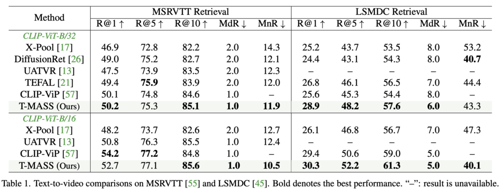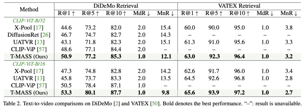 그럼에도 불구하고, T-MASS는 다른 데이터셋과 백본(backbone) 모델에서 CLIP-ViP보다 우수한 성능을 보였고표 3에서는 video-to-text task 에서도 최고의 성능을 달성함을 확인할 수 있습니다.