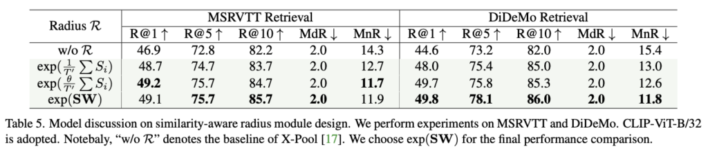 Table 5에서는 Similarity-Aware Radius Module의 구현 방법으로 세 가지 옵션을 제시합니다. 첫 번째 옵션은 cosine similarity만을 사용한 방식. 두 번째는 학습 가능한 θ를 도입한 방식이며, 세 번째는 선형 레이어를 사용하는 방식입니다. “w/o R”은 X-Pool의 모델의 베이스라인을 의미합니다. 실험 결과, Radius Module이 성능 향상에 기여했으며, MSRVTT에서 R@1 기준 1.5% 이상, DiDeMo에서 3% 이상 성능이 향상되었습니다. 이는 텍스트를 의미 범위로 표현하는 것이 검색 성능에 유리하다는 것을 보여줍니다. 또한, 학습 가능한 모듈을 도입하면 텍스트 질량의 표현력과 유연성이 향상되어 성능이 추가적으로 개선됩니다. 세 번째 방식이 대부분의 경우 가장 뛰어난 성능을 보여 이를 최종 모델로 사용하였습니다.
