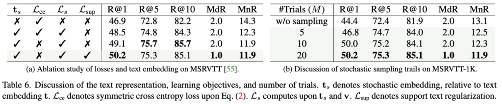 Table 6a에서는 MSRVTT 데이터셋을 기반으로 텍스트 표현과 학습 목표에 따른 성능을 분석한 결과를 제공합니다. X-Pool 모델에서는 텍스트 임베딩 t를 확률적 텍스트 임베딩 ts로 대체하고, 손실 함수 Ls를 추가했을 때 1.6% 성능 향상이 있었습니다. 하지만 확률적 임베딩 ts에서 원래의 손실 함수 Lce를 추가하면 성능이 오히려 저하되었고, 이는 t에 대한 학습이 text mass 학습에 편향을 주기 때문입니다. 대신, tsup를 사용하여 text mass의 크기와 이동을 조정한 결과 성능이 향상됨을 확인할 수 있습니다.
