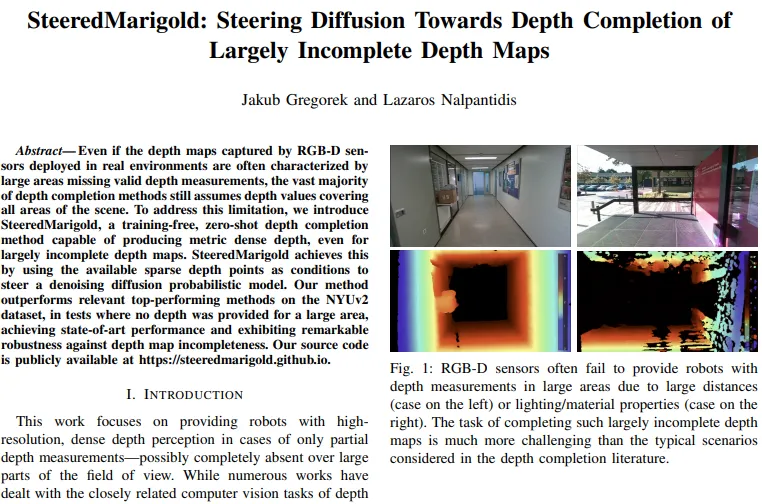 안녕하세요, 59번째 x-review 입니다. 이번 논문은 arXiv 2024에 올라온 SteeredMarigold라는 논문으로, Depth estimation 모델인 Marigold를 기반으로 Depth completion을 수행한 논문 입니다.