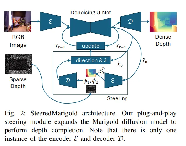 우선 논문의 이름에도 있는 steering은 기존 RGB만 사용하는 diffusion 모델을 sparse depth를 가이드로 사용하여 dense한 metric depth을 생성할 수 있도록 확장하는 과정을 의미합니다. 기존 모델을 재학습 없이 그대로 사용하면서도 다중 모달리티의 입력 데이터를 처리할 수 있게 되는 것이죠.