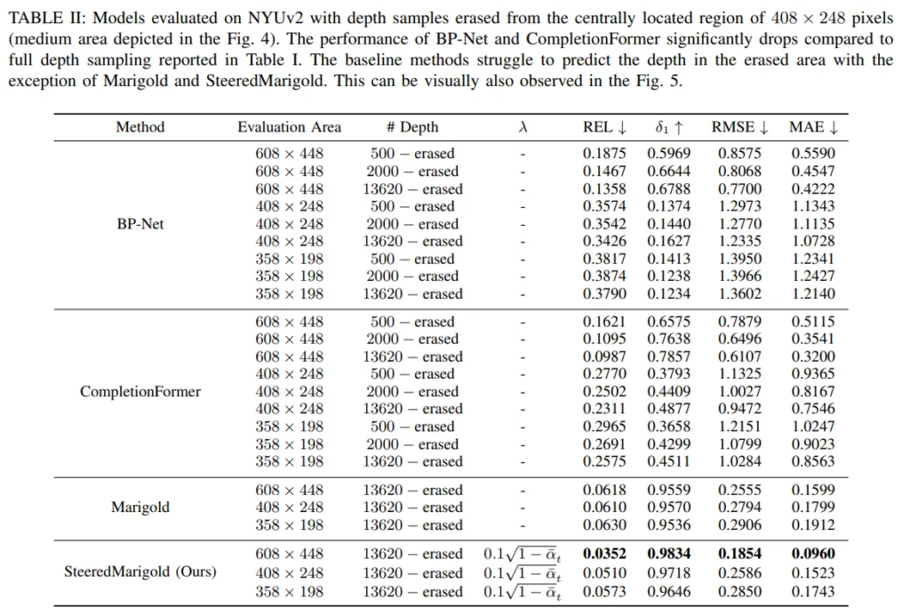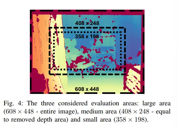 Fig.4에서 large area는 실제로 사용하는 depth map의 해상도를 의미하며, medium area는 아예 depth 값을 지워버리는 영역, 그리고 small area가 지정되어 있습니다. small area는 steering이 depth가 있는 주변 영역으로부터 영향을 받아 없는 영역을 채우는 것인데요, 다른 말로 하면 너무 멀리 떨어진 곳은 그 영향이 줄어들 수 있습니다. 그래서 가장 중심부로 small area를 지정하여 주변 조건으로부터 멀리 떨어진 영역을 설정함으로써 depth가 없는 진짜 중심 영역까지 잘 복원할 수 있는지를 평가하고 있습니다.