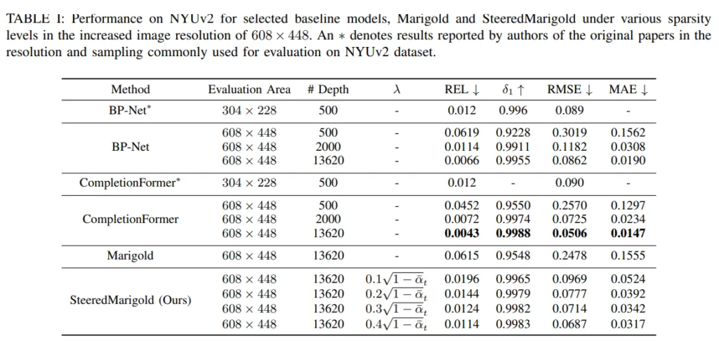 Marigold를 단독으로 사용하면 diffusion 기반 모델로 학습되긴 했지만, sparse depth를 단순히 scale/shift를 계산하는 용으로만 사용하면서 정확하게 조건에 맞게 복원하지 못하여 비교적 낮은 성능을 보이고 있습니다. 여기서 steering 기법을 적용했을 때 같은 13620을 포인트로 사용하지만 성능이 개선되는 것을 확인할 수 있습니다. 이 결과를 통해 고해상도 이미지로 인해 sparse한 상황에서도 본 논문이 잘 작동하며, Marigold에서 steering만을 추가하여 모델을 훨씬 강인하게 동작하도록 만들었다는 것을 알 수 있습니다.