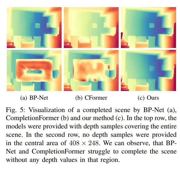 Tab.2는 앞서 Fig.4로 설명한거소가 같이 중간 영역에 해당하는 부분에서 depth 값을 지움으로써 평가하는데요, 실험 결과 성능이 크게 하락하는 것을 확인할 수 있습니다. 베이스라인 모델들은 sparse함과는 무관하게 아예 지워진 영역이 발생한 곳에 대해서 depth를 예측할 수 없게 되면서 낮은 성능을 보이게 됩니다.