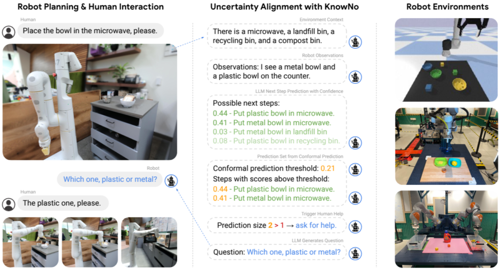 해당 문제는 안전과도 직결되는 치명적인 문제가 될 수 있습니다. 한 가지 예시를 들어보면 위 그림의 왼쪽에 선반 위에 금속 그릇과 플라스틱 그릇이 있습니다. 사용자는 이런 환경에서 “Place the bowl in the microwave, please”라는 명령어를 로봇에게 지시하게 되죠. 해당 경우에서는 그릇이 두 개가 존재하기 때문에 모호합니다. (이런 숫자로 모호환 경우에 오른쪽에 위치한 객체를 우선하여 파지하도록 설계가 되었다고 가정하고) 로봇이 아무런 의심 없이 금속 그릇을 전자레인지이 넣을 경우, 화재와 같은 안전 문제가 발생 할 수 있습니다.