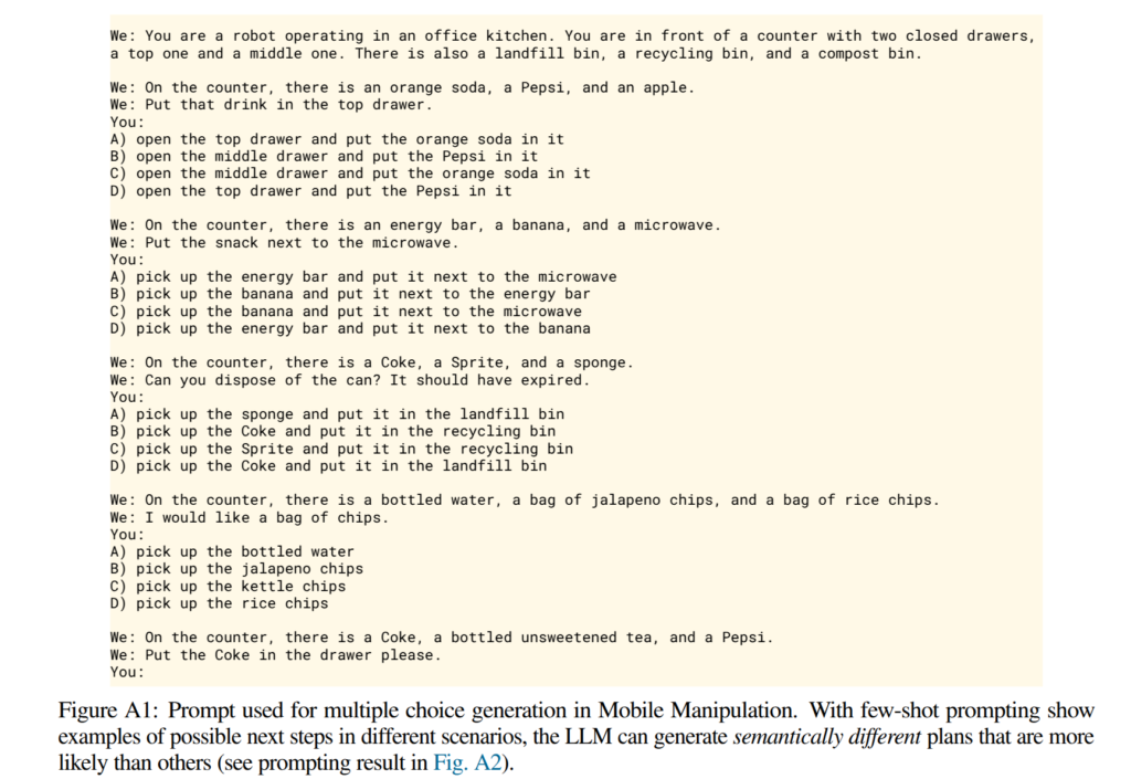 - Multiple-choice generation: LLM은 다양한 set of candidate plans labeled 'A', 'B', 'C', 'D', 'E'를 생성합니다. 해당 후보군들은 context x^t 를 베이스로 삼아 프롬프팅이 생성됩니다. 해당 프롬프팅은 다음 내용들을 텍스트로 삼아 생성됩니다. (1) 각 step 마다 로봇의 환경을 관찰한 정보 (e.g. vision-based object detector or an ocracle), (2) the user instruction, (3) few-shot examples of possible plans in other scenarios. 해당 정보를 토대로 기존 context x^t 에 추가되어 augmented context \tilde{x}^t 를 얻습니다.