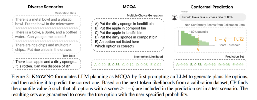 저자는 MCQA로부터 normalize score를 추출하여 이를 conformal prediction (CP) 프레임워크를 적용합니다. CP를 통해 candidate next steps에서 MCQA에 대한 후보를 줄이고, 줄어든 후보가 단일 후보라면 해당 step을 선택하고 여러 개라면 유저에게 도움을 요청합니다. 전반적인 과정은 fig 2에서도 확인 가능합니다.